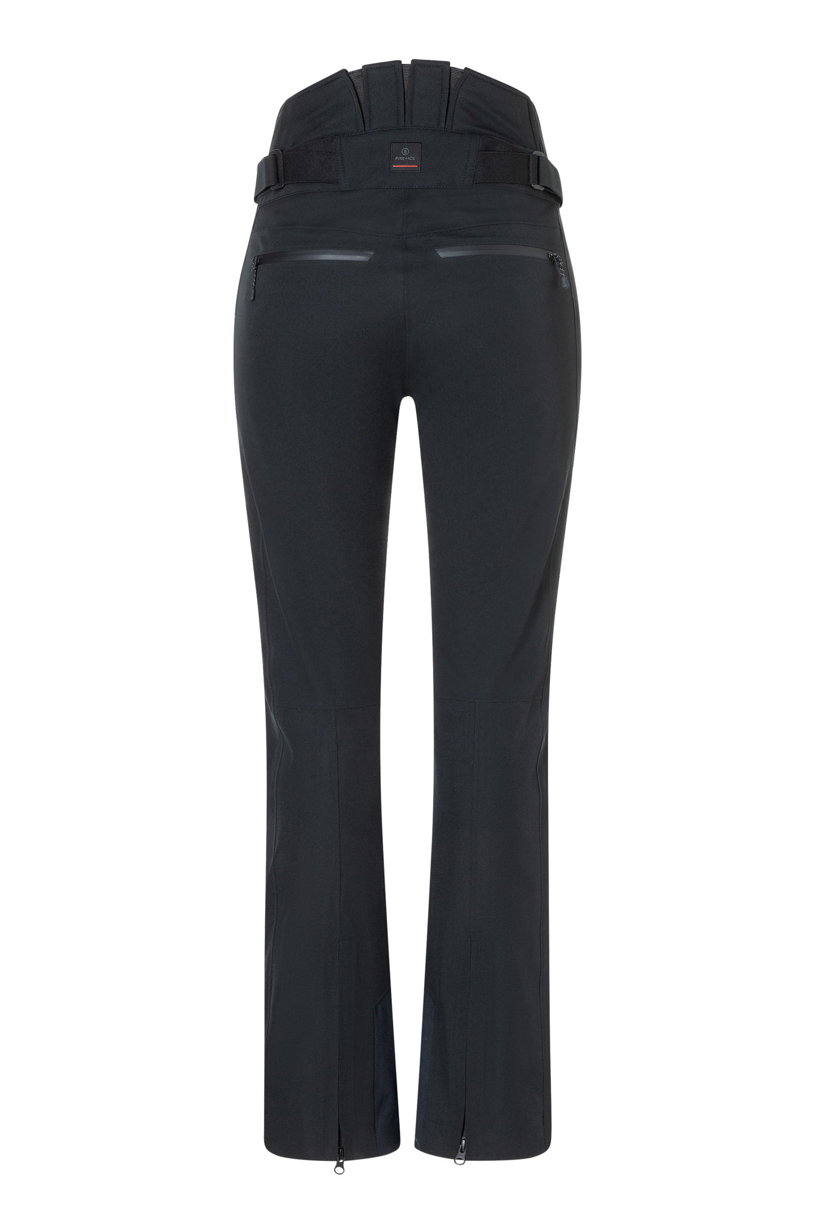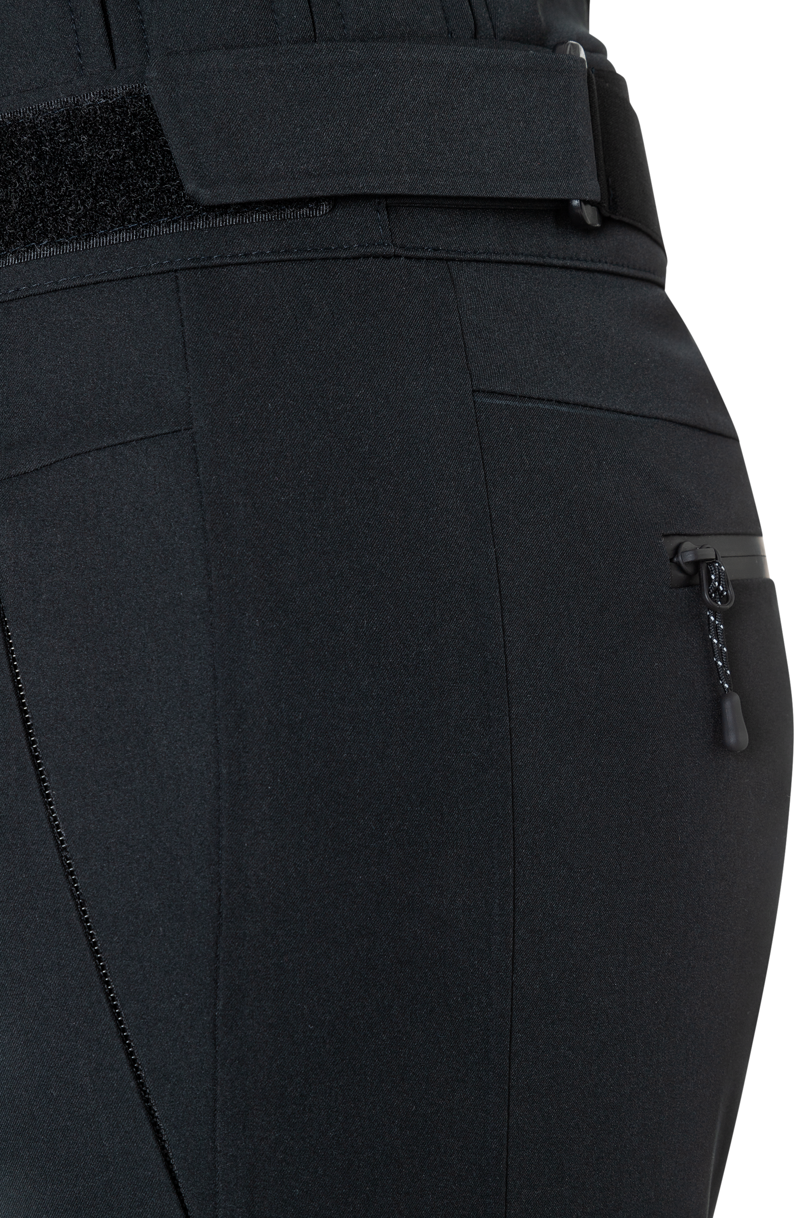 Slim, straight cut with high waist;Raised, lightly padded waistband in the lumbar area with elasticated inserts; Fastens with a zip and two FIRE+ICE press studs;Velcro tabs at the sides and logo patch at the back;Two zipped side pockets and two zipped back pockets;Underlaid hem slit with zip at the back;Snow skirt with elasticated cuffs at the hem; Edge protection on the inside leg hem;Taped seams;Made from waterproof breathable 4-way stretch made from 100% recycled polyester (GRS certified);Water column 10,000 mm, breathability 15,000 g/m²/24h;Thinly padded;Certified according to OEKO-TEX® STANDARD 100