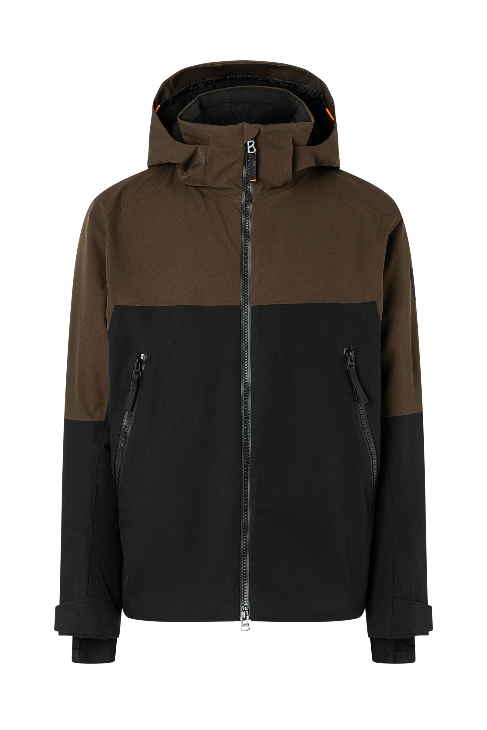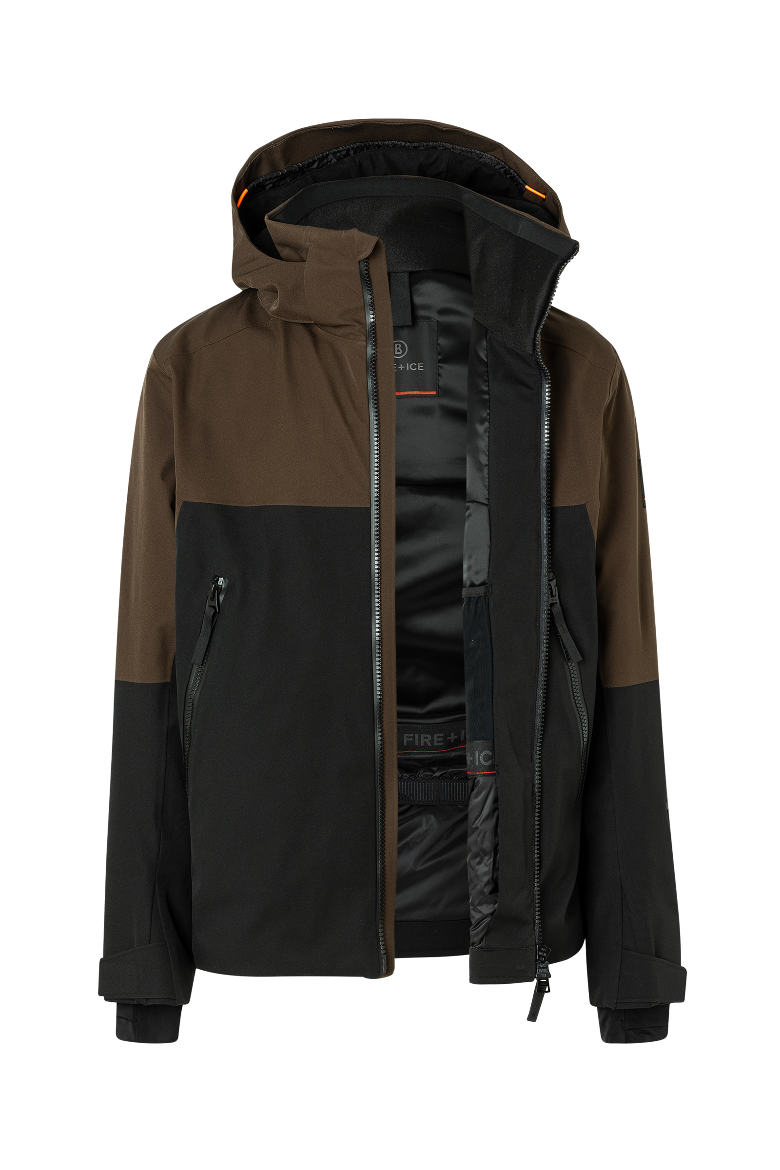Straight cut;Detachable zip hood with drawstring and elasticated cord;Fastens with two-way zip with B logo pendant;Two zipped side pockets;Mesh-lined zip ventilation slits on the side sleeve seam;Drawstring with elasticated cord at the hem;Width-adjustable sleeve hem with velcro fastener;Jersey cuffs with thumb hole;FIRE+ICE patch and zip pass pockets on the left sleeve;Two mesh pockets and inner snow skirt with press studs;Made from two-layer waterproof and breathable 4-way stretch with recycled content (GRS-certifiec);Water column 10,000mm, breathability 15,000 g/m²/24h;Certified according to OEKO-TEX® STANDARD 100;