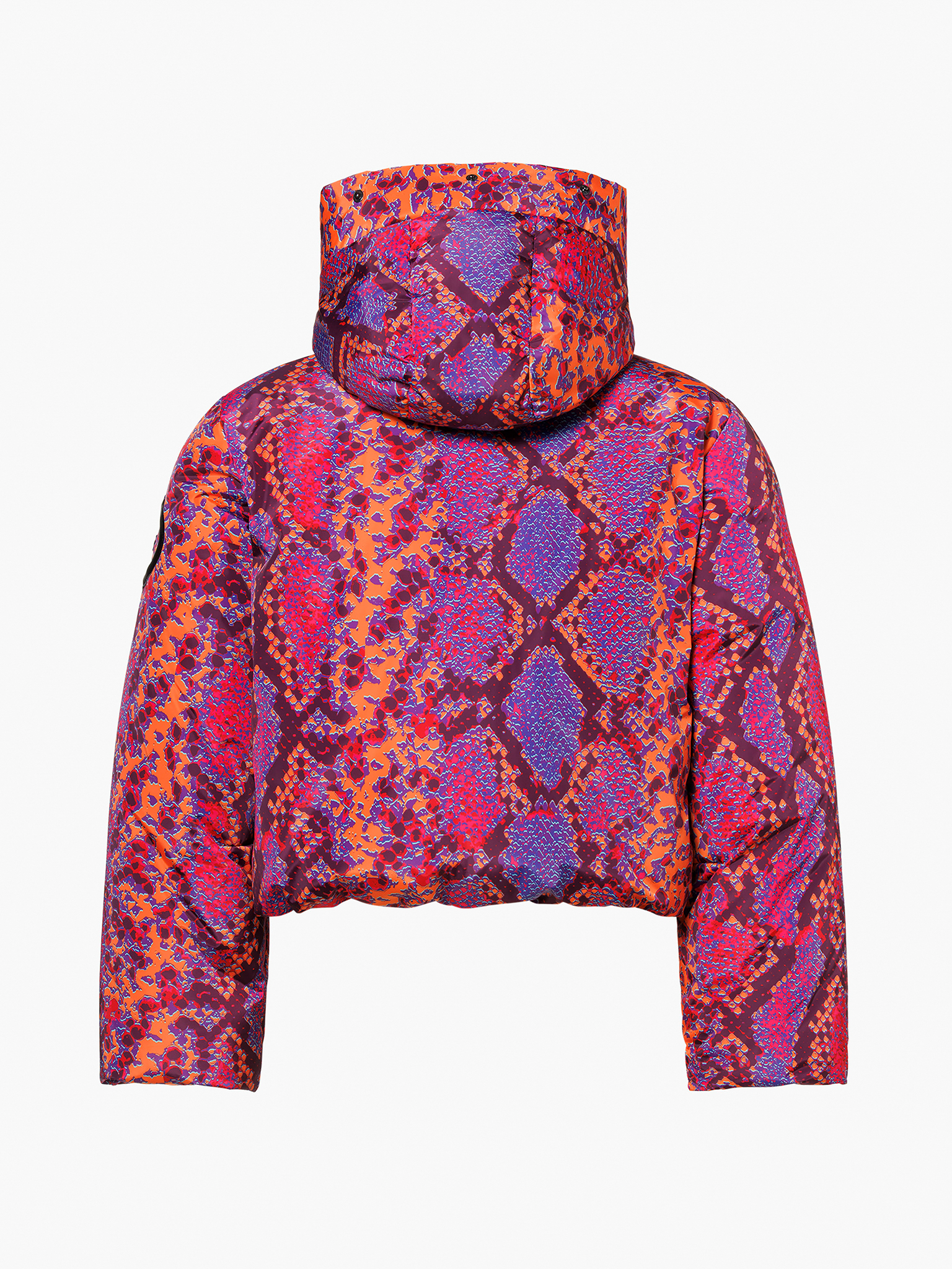 Down jacket with hood and allover print