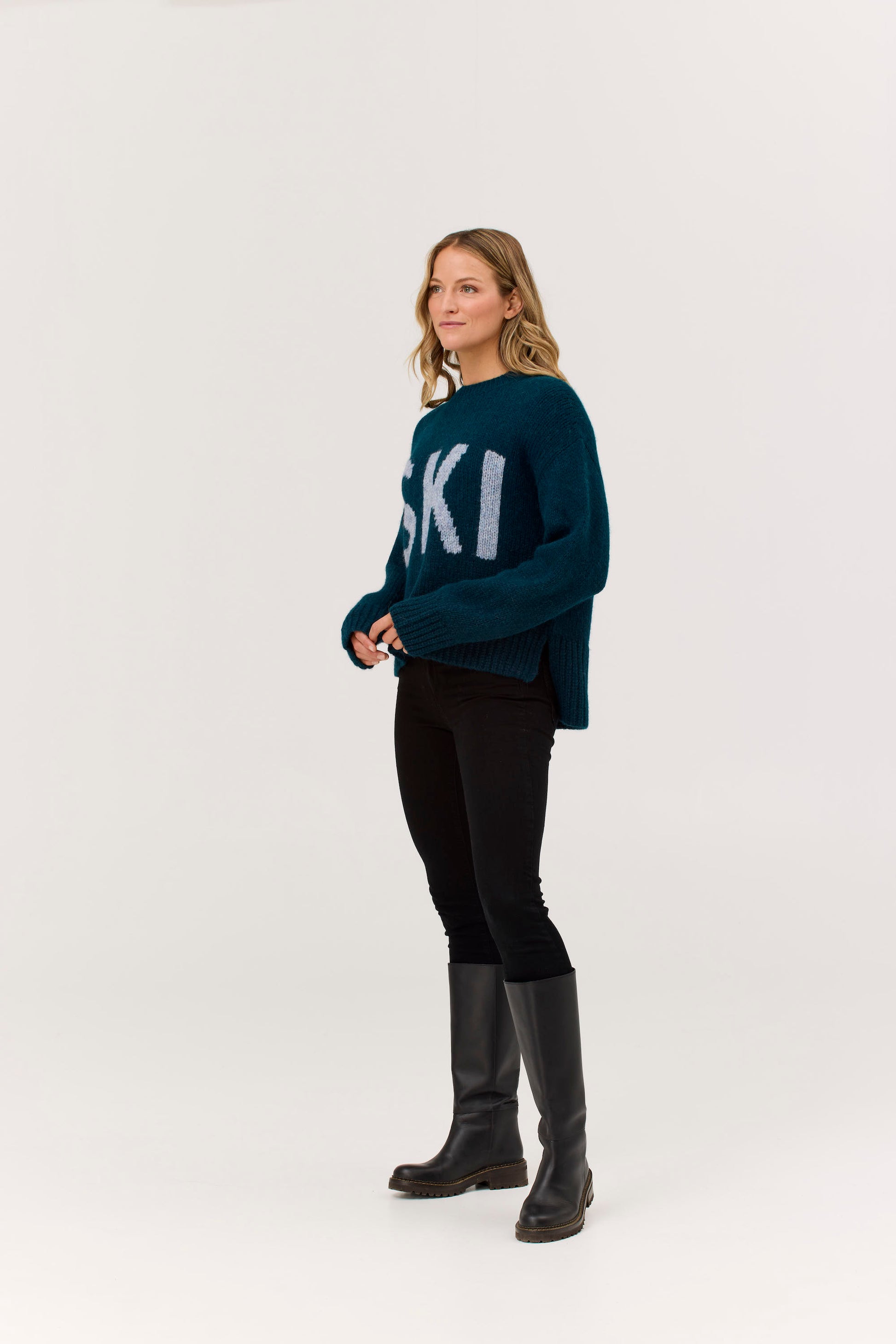 Let everyone know what you’re about. The Ski Sweater features bold knit lettering, luxe comfort, and a loose fit that layers beautifully under jackets or over cocoa sessions.