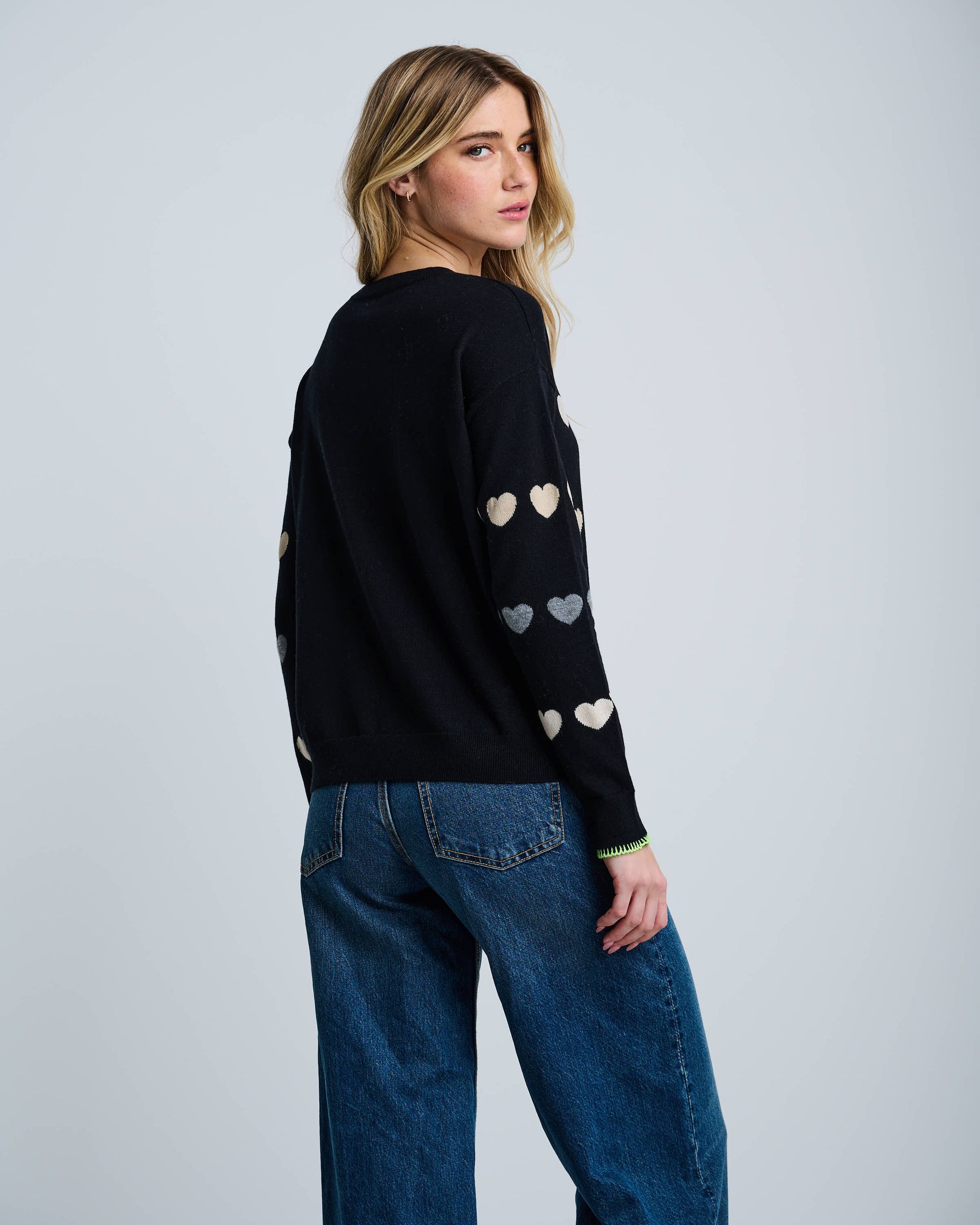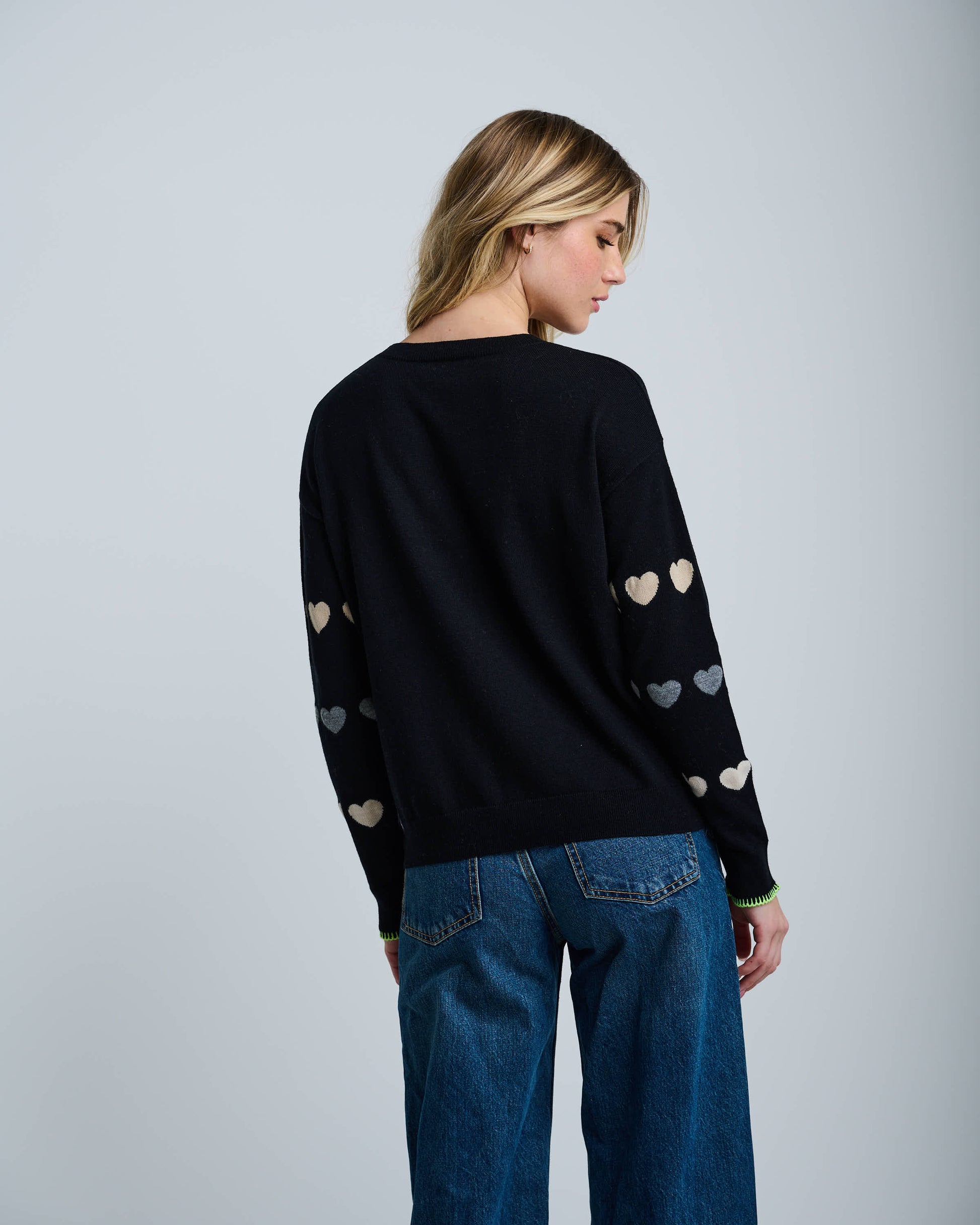 Black long sleeve knit sweater with ivory & grey hearts