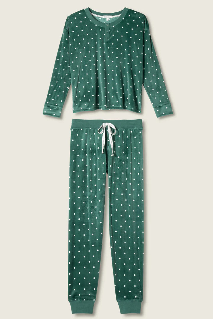 Silky-soft forest-green velour makes this set as plush as it is festive. The long sleeve henley top features a button placket and banded cuffs, paired with jogger-style pants finished with a drawstring waist and cuffed hems. Scattered in playful white dots, it’s made for holiday lounging that feels a little luxe.